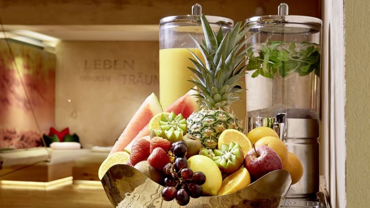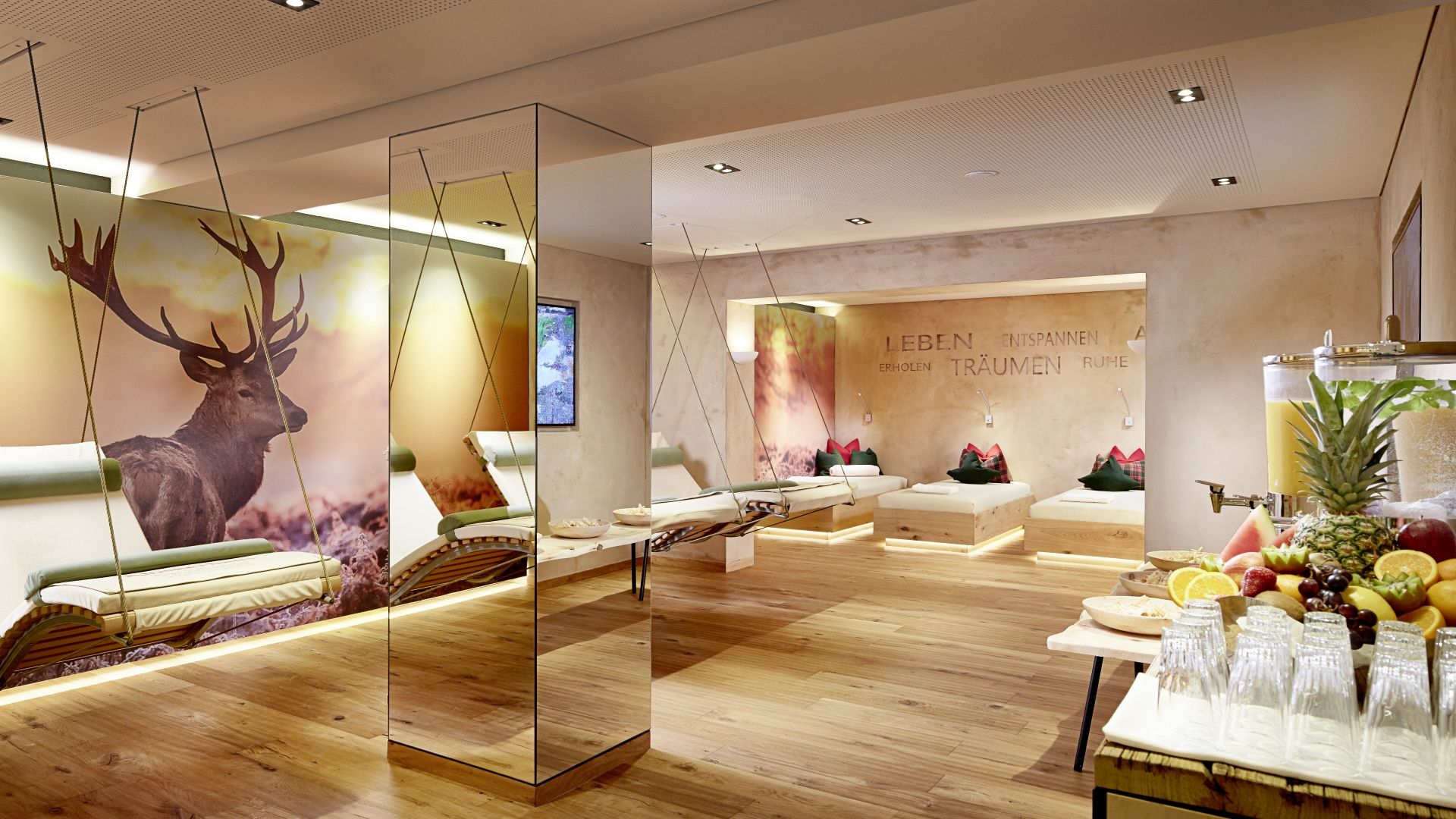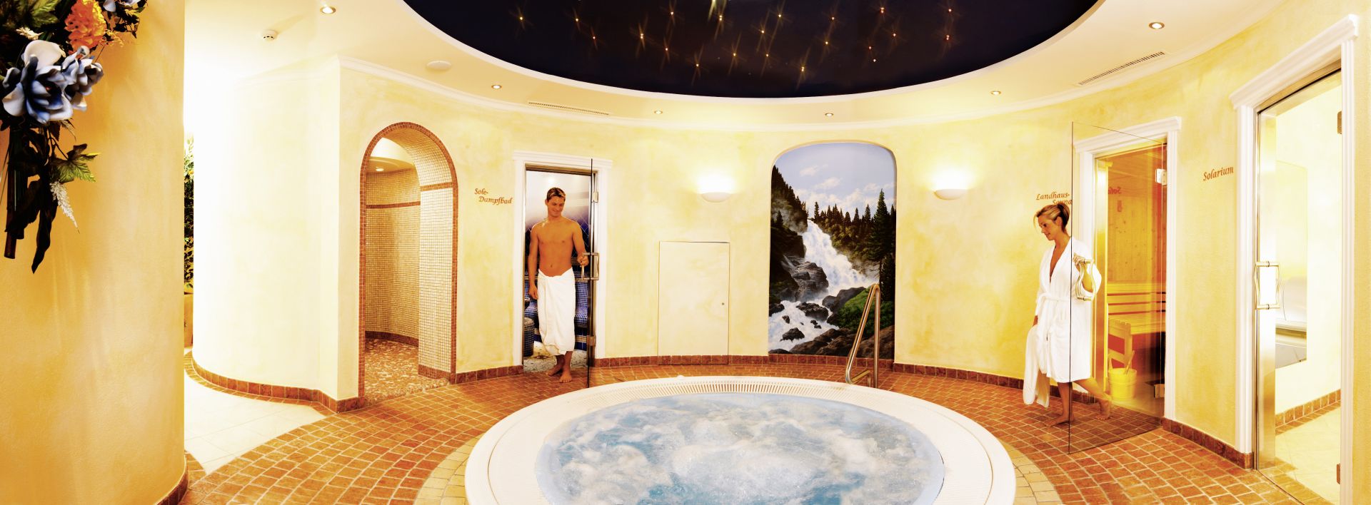 Wellnessoase mit Whirlpool, Landhaussauna, Zirbenschwitzstube, Soledampfbad, Infrarotkabine mit Farblichttherapie, Solarium, Erlebnisdusche, Ruhe- und Relaxraum, Massage- und Fitnessraum