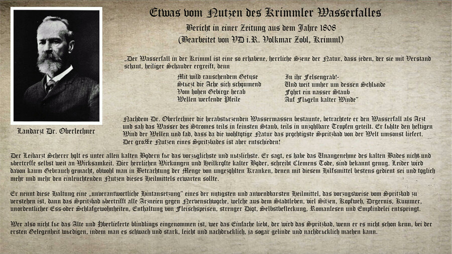 Bereits im Jahre 1808 berichtet der Landarzt Dr. Oberlechner in einem Zeitungsartikel von der Wirksamkeit der Krimmler Wasserfälle. Nachdem Dr. Oberlechner die herabstürzenden Wassermassen bestaunte, betrachtete er den Wasserfall und sah das Wasser des Stromes teils in feinsten Staub, teils in unzählbare Tropfen geteilt. Er fühlte den heftigen Wind der Wellen und fand, dass da die wohltätige Natur das prächtigste Spritzbad von der Welt umsonst liefert: ...denn das Spritzbad der Krimmler Wasserfälle übertrifft alle Arzneien gegen Nervenschwäche, welche aus dem Stadtleben, viel Sitzen, Kopfweh, Ärgernis, Kummer, unordentlichen Ess-oder Schlafgewohnheiten, Enthaltung von Fleischspeisen, strenger Diät, Selbstbefleckung, Romanlesen und Empfindelei entspringt.