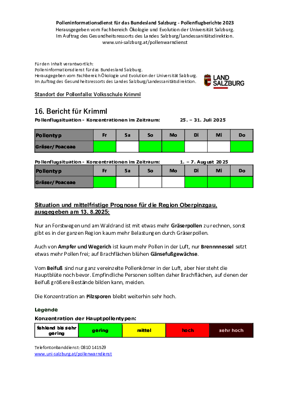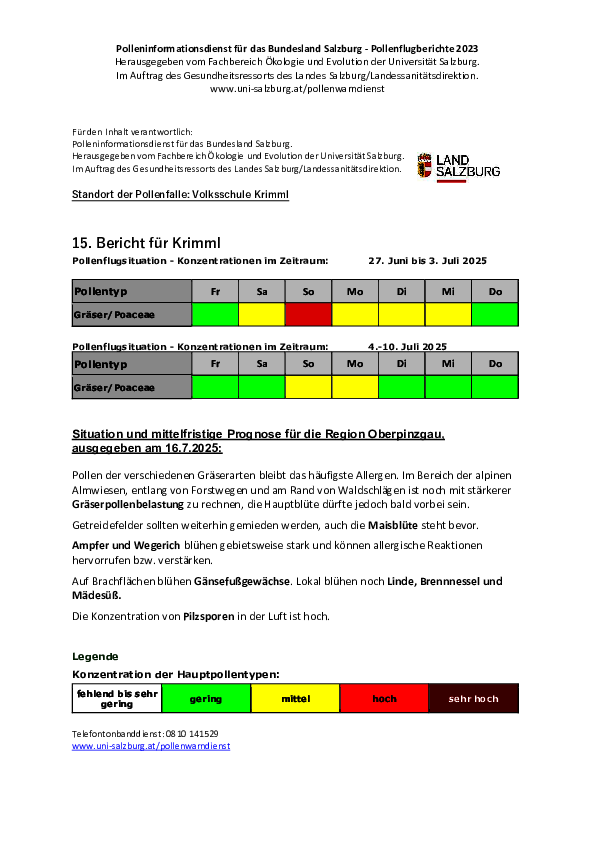 Anbei eine Übersicht über die aktuelle Pollensituation in Krimml.